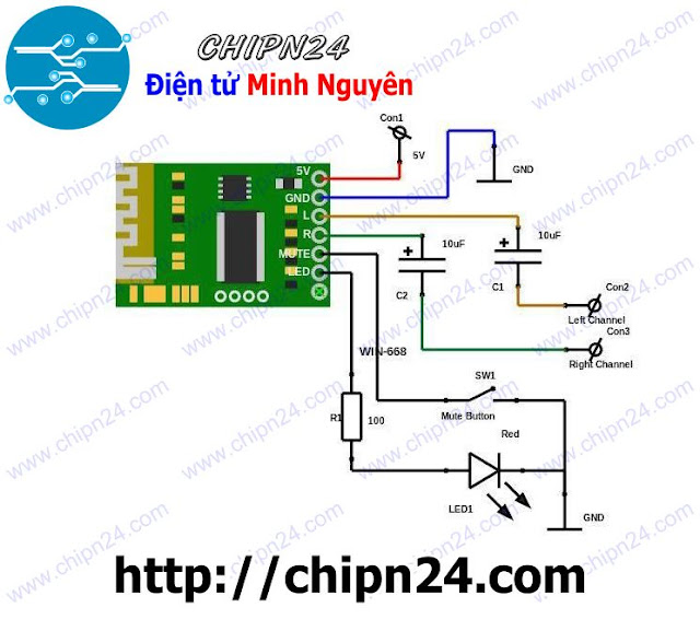 - Sản phẩm kèm theo led và tụ lọc chống nhiễu cho trường hợp mạch khuếch đại không có tụ lọc nguồn, các bạn tham khảo sơ đồ bên dưới để biết cách đấu