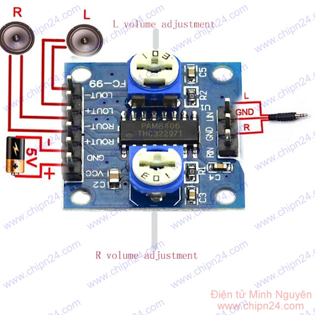 - Mạch khuếch đại âm thanh sử dụng IC PAM8406 cho ngõ ra 2 kênh L-R, công suất mỗi kênh 5W