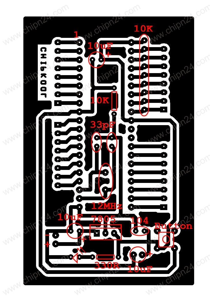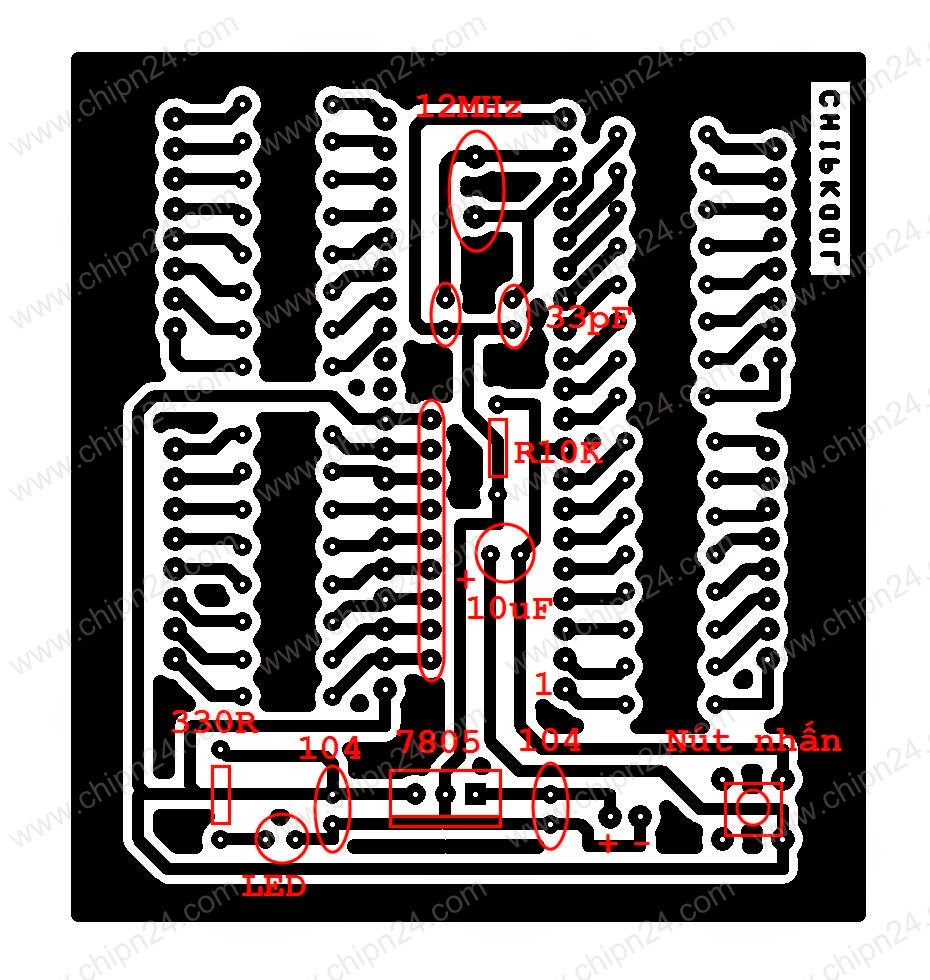 Sau khi bạn có mạch rồi,bạn chỉ việc cắm linh kiện sao cho đúng thôi,đầu tiên bạn cắm đế chip 89C51,sau đó cắm các linh kiện bên trong đế chip,thạch anh,điện trở,tụ gốm cắm kiểu gì cũng đươc,còn tụ hóa bạn nhìn có 1 cạnh có dấu âm chân đó là chân âm,chân còn lại là dương rôi nối với chân 31,bạn chỉ việc dò chân trên sơ đồ chip như sau: